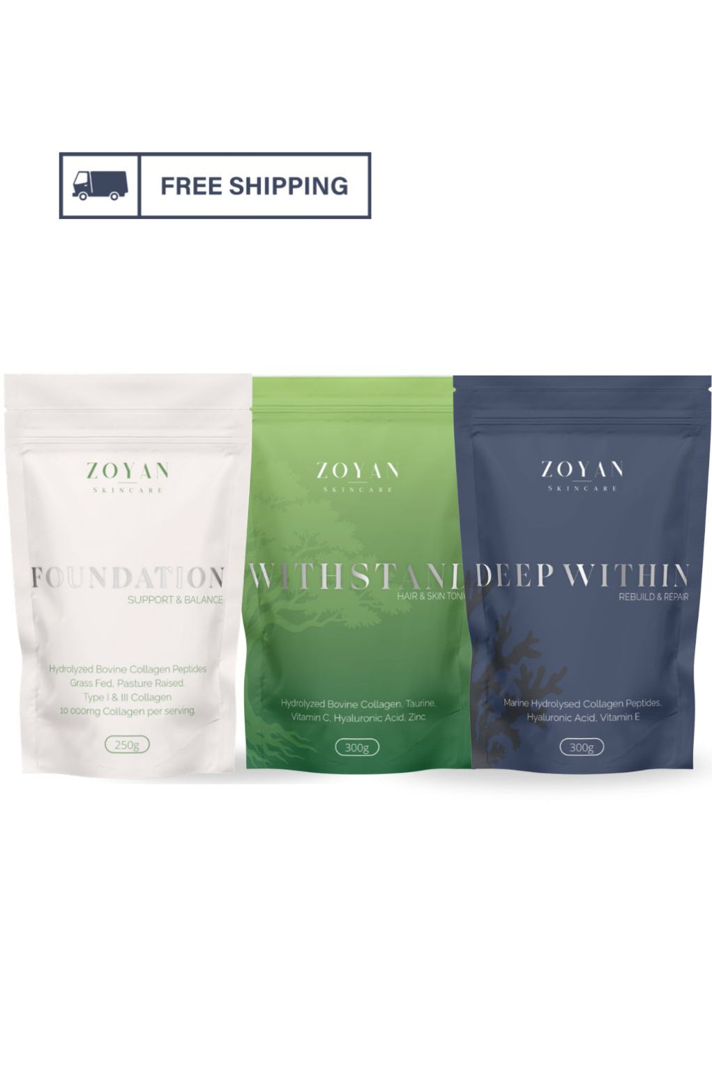 The Complete Set brings together all three Zoyan collagen formulas to support visible glow, stronger hair, and deeper balance — in one simple, complete routine.